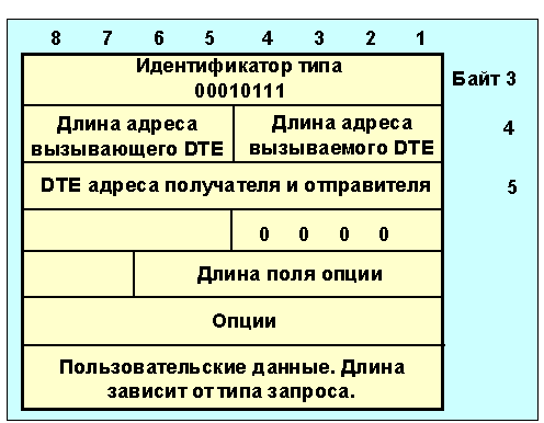 x - отмечет разряды, которые могут принимать значения 0 или 1. Четырехбитовые поля длина адреса отправителя и длина адреса получателя характеризуют длины последующих полей переменной длины. Длина выражается в полуоктетах. Далее следуют соответствующие адреса. В каждом полуоктете записывается десятичная цифра адреса, при необходимости поле адреса дополняется нулями до целого числа октетов. Для пакетов установления связи кадры имеют формат, показанный на рис. 4.3.2.4.
