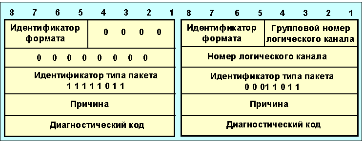 Рис. 4.3.2.16. Форматы пакетов типа отказ для нумерации по модулю 8 (слева) и 128 Программное обеспечение принимающей и передающей сторон должно иметь переменные состояния V(R) и V(S), содержащие, соответственно, номера пакетов, которые предстоит получить и послать (см. описание процедуры HDLC). После посылки очередного пакета с N(S) значение V(S) увеличивается на 1. Принимающая сторона сравнивает V(R) с N(S) полученного пакета, при совпадении укладывает N(S) в поле N(R) пакета-отклика и инкрементирует V(R). Отправитель при получении пакета проверяет равенство переменной V(S) и кода поля N(R) в пакете-отклике. Если при получении пакета выясняется, что V(R) не равно N(S), V(R) не инкрементируется, а принимающая сторона отправляет отклик с N(R)=V(R). Отправитель, получив этот отклик и обнаружив, что V(S) не равно N(R), узнает о происшедшем сбое. Номер логического канала (LCN) служит для того, чтобы определить соответствие межу DTE и местным DCE. LCN вместе с полем группового номера логического канала занимают 12 бит, что позволяет иметь до 4095 логических каналов (LCN=0 зарезервировано для использования DCE). 4 бита первого байта управляющего пакета содержат в себе код типа сообщения (таблица 4.3.2.7): Таблица 4.3.2.7 Коды типов сообщений