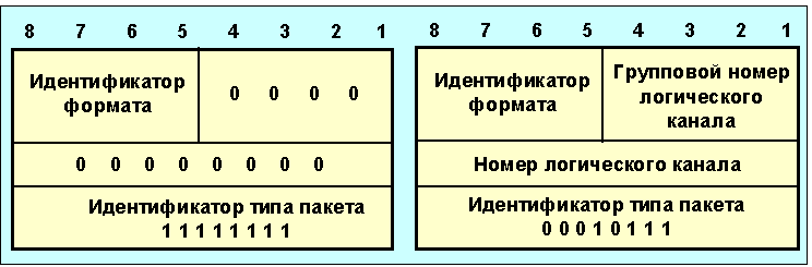 Рис. 4.3.2.6. Формат пакетов подтверждения завершения Для инициализации обмена информацией (первичного или повторного), а также для прерывания виртуальной связи и возвращения виртуальных каналов в исходное состояние используются запросы повторного пуска (и подтверждение повторного пуска). DTE может выдать запрос повторного пуска (к DCE) в любой момент времени, переводя логический канал в исходное состояние. DCE в ответ должно послать сообщение подтверждение повторного пуска. Инициатором повторного пуска может быть и dce, для этого оно посылает сообщение индикация повторного пуска. DTE в результате устанавливает логический канал в исходное состояние и посылает dce сообщение подтверждение повторного пуска. Форматы пакетов, несущих эти сообщения показаны на рис. 4.3.2.6 и 4.3.2.7. Эти пакеты не имеют полей группового номера логического канала и LCN (см. рис. 4.3.2.7 и .8). Процедура повторной установки во многом аналогична повторному пуску и используются всякий раз при выявлении сбоя, чтобы вернуть виртуальную связь или постоянный виртуальный канал в исходное состояние.