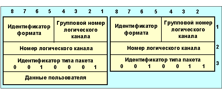 Рис. 4.3.2.8. Формат пакета подтверждения повторного пуска (слева) и повторной установки (справа) Пакеты данных передаются по постоянным виртуальным каналам или через виртуальные соединения после их создания. Пакеты данных распознаются по нулевому младшему биту (бит с номером 1) в третьем октете. Остальные биты этого октета используются для управления. Форматы пакетов данных показаны на рис. 4.3.2.9. Информационное поле начинается с четвертого байта (при расширенной нумерации с пятого) и может иметь длину 16-4096, хотя в рекомендациях стандарта x.25 оговорена величина 128 октетов. Если принимающая сторона не способна принять пакет данной длины, связь должна быть переустановлена, а стороне-инициатору соединения послано сообщение об ошибке. Каждому пакету данные присваивается порядковый номер N(S), значение которого при установлении соединения равно нулю.