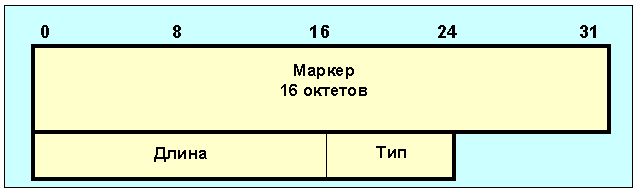 Рис. 4.4.11.4.1. Формат BGP-сообщений об изменениях маршрутов Поле маркер содержит 16 октетов и его содержимое может легко интерпретироваться получателем. Если тип сообщения "OPEN", или если код идентификации в сообщении open равен нулю, то поле маркер должно быть заполнено единицами. Маркер может использоваться для обнаружения потери синхронизации в работе BGP-партнеров. Поле длина имеет два октета и определяет общую длину сообщения в октетах, включая заголовок. Значение этого поля должно лежать в пределах 19-4096. Поле тип представляет собой код разновидности сообщения и может принимать следующие значения: