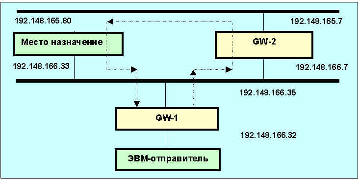Рис. 4.4.11.4.4. Пример разных маршрутов для пути "туда" и "обратно". Предполагается, что оператор находится в ЭВМ-отправителе. Команда traceroute 192.148.166.33 в этом случае выдаст: