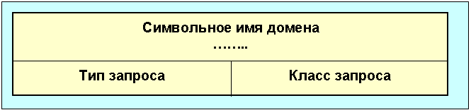 Поле символьное имя домена имеет переменную длину, содержит одно или более субполей, начинающихся с байта длины (0-63). Поле завершается 0. Например, для ns.itep.ru (цифры представляют собой октеты длины):