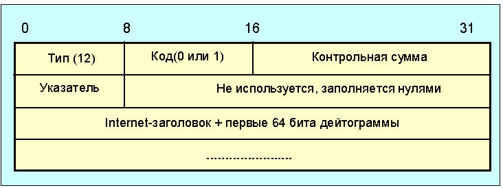 Рис. 4.4.4.8. Формат сообщения "время (ttl) истекло" Значение поля код определяет природу тайм-аута (см. табл. 4.4.4.1). Когда маршрутизатор или ЭВМ выявили какую-либо ошибку, не из числа описанных выше (например, нелегальный заголовок дейтограммы), посылается сообщение "конфликт параметров". Это может произойти при неверных параметрах опций. При этом посылается сообщение вида (рис. 4.4.4.9):