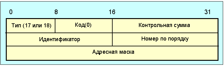 Рис. 4.4.4.11. Формат запроса (отклика) маски субсети Поле тип здесь специфицирует модификацию сообщения, тип=17 - это запрос, а тип=18 - отклик. Поля идентификатор и номер по порядку, как обычно, обеспечивают взаимную привязку запроса и отклика, а поле адресная маска содержит 32-разрядную маску сети. |