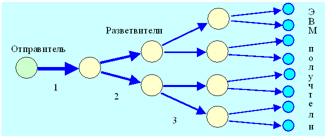 Виртуальная сеть виртуальных сетей - Интернет является самой большой и самой популярной сетью. Можно смело утверждать, что эта сеть сохранит это лидерство в ближайшие годы. Привлекательность сети не только в том, что это единая среда общения людей, находящихся в разных странах и на разных континентах. Интернет предоставляет все более широкий спектр услуг. Это и информационно-поисковые системы, телефония, аудио и видео письма, доставляемые за считанные секунды в любую точку мира (где имеется Интернет), видеоконференции, электронные журналы, службы новостей, дистанционное обучение, банковские операции и многое, многое другое. Интернету предстоит мучительная процедура перехода на 128-битовые адреса (IPv6), но по ее завершении можно ожидать дальнейшего расширения списка услуг. Уже сегодня Интернет стал средой, предоставляющей возможность целевой рекламы и дистанционной торговли. Уже в начале следующего века сети станут самым мощным средством массовой информации. Но для решения всех этих проблем в этой сфере еще очень много надо сделать. Современные поисковые системы, несмотря на впечатляющие успехи, требуют существенного улучшения эффективности, много надо сделать для того, чтобы Интернет пришел в каждую квартиру. Сегодня Интернет использует многие десятки протоколов. Если сюда добавить протоколы физического уровня, то их число превысит сотню. На уровне локальных сетей наиболее распространены различные разновидности Ethernet, а также Token Ring и некоторые другие. Особенно велико разнообразие протоколов межсетевого обмена. Здесь помимо PPP используется FDDI, X.25, ISDN, ATM, SDH, Fibre Channel и пр.. На транспортном уровне в Интернет работают протоколы UDP (без установления соединения) и TCP (с установлением соединения). Это два принципиально разных подхода к передаче данных. В обоих случаях и передатчик и приемник имеют индивидуальные IP-адреса и порты. Но в случае TCP они ассоциируются в соединители (socket) - две пары IP-адрес-порт и прием/передача в рамках одной сессии происходит по схеме точка-точка. Для UDP же допускается возможность передачи одновременно нескольким приемникам (мультикастинг) и прием данных от нескольких передатчиков в рамках одной и той же сессии. Протокол TCP используется для поточной передачи данных, при которой доставка гарантируется на протокольном уровне. Это обеспечивается обязательным подтверждением получения каждого пакета TCP. Напротив, протокол UDP не требует подтверждения получения. В этом случае, как правило, исключается также и фрагментация пакетов, так как пакеты при схеме без установления соединения никак не связаны между собой. По этим причинам UDP в основном служит для передачи мультимедийных данных, где важнее своевременность, а не надежность доставки. Протокол TCP используется там, где важна надежная, безошибочная доставка информации (файловый обмен, передача почтовых сообщений и WEB-технология). Схема без установления соединения привлекательна также тем, что позволяет при передаче данных от исходного источника к большому числу приемников минимизировать общий трафик. Если бы для этой цели использовался протокол TCP, то при N приемниках надо было бы сформировать N виртуальных каналов и транспортировать N идентичных пакетов (рис. 4.4.1). В случае UDP от передатчика до точки разветвления передается только один пакет, что уменьшае