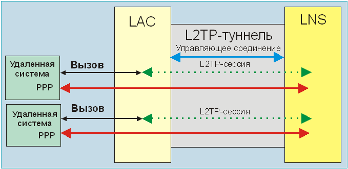 Туннель и соответствующий управляющий канал должны быть сформированы до инициализации входящего или исходящего вызовов. L2TP-сессия должна быть реализована до того, как L2TP сможет передавать PPP-кадры через туннель. В одном туннеле могут существовать несколько сессий между одними и теми же LAC и LNS.