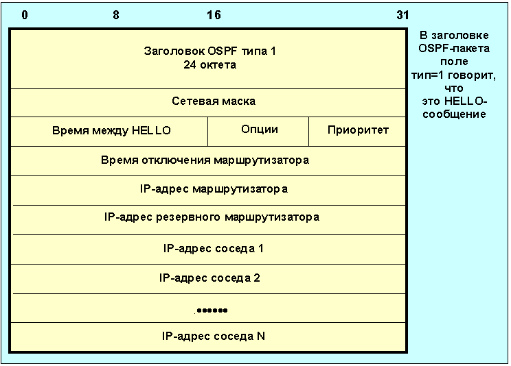 Любое сообщение ospf начинается с 24-октетного заголовка: