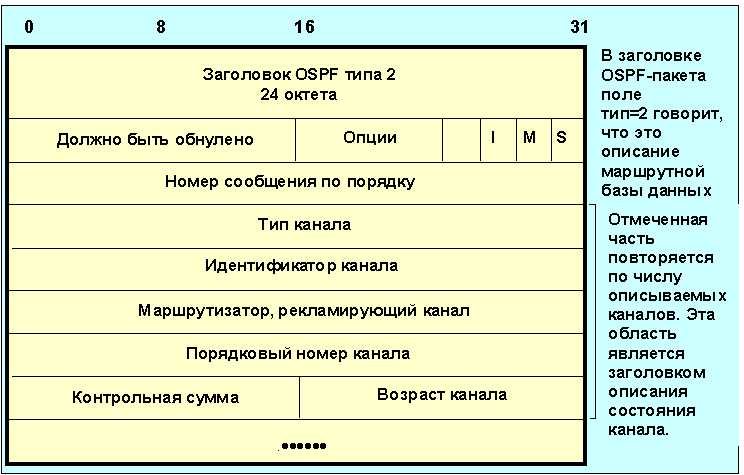 Рис. 4.2.11.2.5 Формат OSPF-сообщений о маршрутах Поля, начиная с тип канала, повторяются для каждого описания канала. Так как размер базы данных может быть велик, ее содержимое может пересылаться по частям. Для реализации этого используются биты I и М. Бит I устанавливается в 1 в стартовом сообщении, а бит M принимает единичное состояние для сообщения, которые являются продолжением. Бит S определяет то, кем послано сообщение (S=1 для сервера, S=0 для клиента, этот бит иногда имеет имя MS). Поле номер сообщения по порядку служит для контроля пропущенных блоков. Первое сообщение содержит в этом поле случайное целое число M, последующие M+1, M+2,...M+L. Поле тип канала может принимать следующие значения: Таблица 4.2.11.2.3. Коды типов состояния каналов (LS)