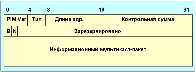 Рис. 4.4.9.5.7. Формат сообщения register Поле B - (бит border) пограничный бит. B=1, если маршрутизатор непосредственно соединен с отправителем. Поле N - бит нулевого регистра. n устанавливается DR равным 1 при тестировании RP до истечения времени регистрации (register-suppression timer). Поле информационный мультикаст-пакет представляет собой оригинальное сообщение, посланное отправителем. Сообщение register-stop является уникастным, направляемым от RP к отправителю сообщения register. IP-адрес отправителя является адресом, к которому направлялось сообщение регистрации. IP-адрес места назначения равен адресу отправителя сообщения register. Формат сообщения register-stop показан на рис. 4.4.9.5.8.