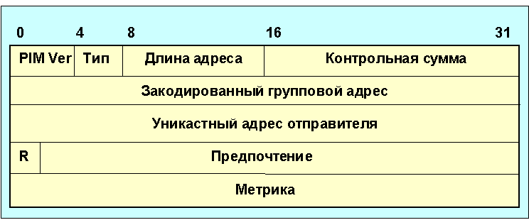 Рис. 4.4.9.5.11. Формат сообщения assert Поле закодированный групповой адрес характеризует групповой адрес места назначения пакетов, который явился причиной посылки сообщения assert. Поле уникастный адрес отправителя содержит IP-адрес отправителя из дейтограммы, вызвавшей посылку мультикастного пакета Assert. Длина поля в байтах определена полем длины адреса. Поле R представляет собой RPT-бит. Если IP мультикастинг дейтограмма, вызвавшая посылку пакета assert направляется вниз по RP-дереву, тогда RPT-бит равен 1. Если маршрутизация осуществляется вдоль SPT, бит равен 0. Поле предпочтение несет в себе значения кода предпочтения, присвоенного уникастному протоколу маршрутизации, который организует проход до ЭВМ. Поле метрика содержит значение метрики для таблицы маршрутизации. Единицы измерения должны соответствовать требованиям маршрутного протокола. Сообщения кандидата RP посылаются периодически C-RP способом и уникастно адресуются к BSR. Формат таких сообщений показан на рис. 4.4.9.5.12.