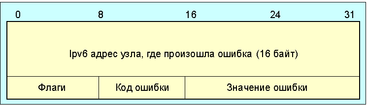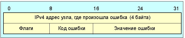 Поле адрес узла, где произошла ошибка является IP-адресом (IPv4 или Ipv6). Флаги 0x01 = InPlace Это значение поля флаги используется только для объектов ERROR_SPEC в сообщении ResvErr. Если флаг = 1, это указывает, что в узле, где произошла ошибка, установлено резервирование. 0x02 = NotGuilty Это значение поля флаги используется только для объекта ERROR_SPEC в сообщении ResvErr. Это значение устанавливается для интерфейса в прикладной программе получателя. Если флаг имеет такой код, спецификация FLOWSPEC, которая вызвала ошибку, больше запрошенной получателем. Код ошибки.Одно-октетное поле кода описания ошибки. Значение ошибки Двухоктетное поле, содержащее дополнительную информацию об ошибке. Его содержимое зависит от типа ошибки. Значения поля код ошибки и значение ошибки приведены в приложении B (см. ниже). Класс SCOPE = 7.