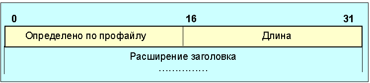 В протоколе RTP предусмотрен механизм расширений заголовка, который позволяет модифицировать заголовок и экспериментировать с новыми форматами поля данных. Этот механизм устроен так, что расширения заголовка могут игнорироваться приложениями, которые не нуждаются в расширениях. Расширения заголовка предназначены для ограниченного использования. И многие приложения лучше реализовать, используя профайл. Формат реализации расширений показан на рис. 4.4.9.2.2.