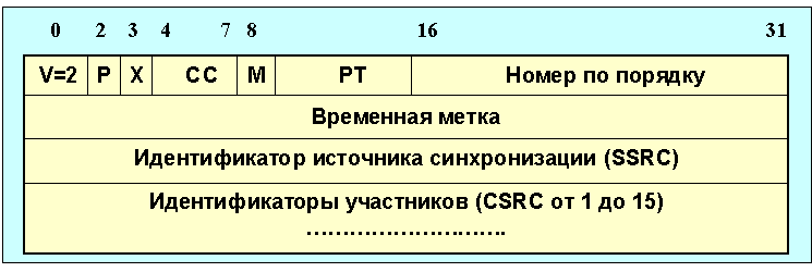 Рис. 4.4.9.2.1. Заголовок пакета RTP Первые 12 октетов присутствуют во всех RTP-пакетах, в то время как список CSRC-идентификаторов присутствует только, когда пакет формируется смесителем. Поля имеют следующие назначения: v (Версия): 2 бита Это поле идентифицирует версию протокола RTP. В настоящее время в это поле записывается код 2. Значение 1 использовалось в опытной версии RTP, а код 0 - в аудио приложении "vat". p (Заполнитель): 1 бит Если Р=1, пакет содержит один или более дополнительных октетов-заполнителей в конце поля данных (заполнители не являются частью поля данных). Последний октет заполнителя содержит число октетов, которые должны игнорироваться. Заполнитель нужен при использовании некоторых алгоритмов шифрования при фиксированном размере блоков или при укладке нескольких RTP-пакетов в один UDP. x (Расширение): 1 бит Если бит Х=1, далее следует фиксированный заголовок, за которым размещается одно расширение заголовка. CC(CSRC count - число CSRC): 4 бита Число CSRC содержит код количества csrc-идентификаторов, которые записаны в пакете. M (маркер): 1 бит Интерпретация маркера определяется профайлом. Предполагается разрешить выделять в потоке пакетов существенные события, такие как границы кадра. Профайл может определить дополнительные маркерные биты или специфицировать отсутствие маркерных битов путем изменения числа битов в поле PT. PT(Тип данных): 7 бит Это поле идентифицирует формат поля данных RTP-пакета и определяет интерпретацию его приложением. Могут быть определены дополнительные коды типа данных. Исходный набор кодов по умолчанию для аудио и видео задан в профайле Internet-draft draft-ietf-avt-profile, и может быть расширен в следующих редакциях стандарта assigned numbers (RFC-1700) [5]. Номер по порядку: 16 бит Номер по порядку инкрементируется на 1 при посылке очередного RTP-пакета данных, этот код может использоваться получателем для регистрации потерь пакетов и для восстановления истинного порядка присланных фрагментов. Начальное значение кода является случайным. Алгоритм генерации таких кодов рассмотрен в [6]. Временная метка: 32 бита Временная метка соответствует времени стробирования для первого октета в информационном RTP-пакете. Время стробирования должно быть получено от часов, показания которых увеличиваются монотонно и линейно, чтобы обеспечить синхронизацию и вычисление временного разброса. Разрешающая способность часов должна быть достаточной для обеспечения приемлемой точности синхронизации (одного тика на видео кадр обычно не достаточно). Частота часов зависит от формата данных и задается статически в профайле, в спецификации поля данных, или динамически средствами, выходящими за пределы спецификации протокола RTP. Если RTP-пакеты генерируются периодически, используется временная привязка, определенная задающим генератором стробирования, а не показаниями системных часов. Начальное значение временной метки является случайным. Несколько последовательных RTP-пакетов могут иметь идентичные временные метки, если логически они генерируются одновременно (например, относятся к и тому же видео кадру). SSRC: 32 бита Поле SSRC идентифицирует источник синхронизации. Этот идентификатор выбирается случайным образом, так чтобы в пределах одной RTP-сессии не было двух равных SSRC-кодов. Все приложения должны быть способны выявлять случаи равенства SSRC-кодов. Если отправитель изм
