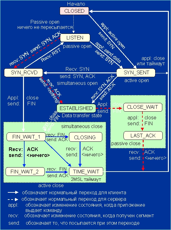 Стандартная процедура установления связи представлена на рисунке 4.4.3.3 (под словом "стандартная" подразумевается отсутствие каких-либо отклонений от штатного режима, например, одновременного открывание соединения со стороны сервера и клиента). Если же соединение одновременно инициируется клиентом и сервером, в конечном итоге будет создан только один виртуальный канал.
