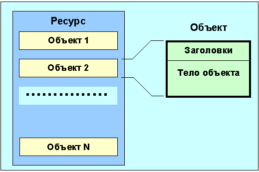 Рис. 4.5.6.1.2. Структура ресурса и объекта Протокол HTTP представляет собой протокол запросов-откликов. Клиент посылает запрос серверу в форме, определяющей метод, URI и версию протокола. В конце запроса следует MIME-подобное сообщение, содержащее модификаторы, информацию о клиенте и, возможно, другие данные. Сервер откликается, посылая статусную строку, которая включает в себя версию протокола, код результата (успех/неудача) и MIME-подобное сообщение, в котором содержатся данные о сервере и метаинформация. Большинство HTTP-обменов инициируются пользователем и состоят из запросов ресурсов, имеющихся на определенном сервере. В простейшем случае такой запрос может быть реализован путем соединения пользовательского агента (UA) и базового сервера. Более сложная ситуация возникает, когда присутствует один или более посредников в цепочке обслуживания запроса/отклика. Существует три стандартные формы посредников: прокси, туннель и внешний порт (gateway). Прокси представляет собой агент переадресации, получающий запрос для URI, переписывающий все сообщение или его часть и отправляющий переделанный запрос серверу, указанному URI. Внешний порт (gateway) представляет собой приемник, который работает на уровень выше некоторых других серверов и транслирует, если необходимо, запрос нижележащему протоколу сервера. Туннель действует как соединитель точка-точка и не производит каких-либо видоизменений сообщений. Туннель используется тогда, когда нужно пройти через какую-то систему (например, Firewall) в условиях, когда эта система не понимает (не анализирует) содержимое сообщений.