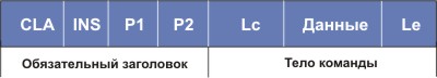Рис. 4.6.4.8. Структура командного APDU. Все поля заголовка имеют по одному байту. Поле данных содержит Lc байт.