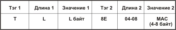 Рис. 4.6.4.13. Формат 1 поля данных команды для безопасного обмена сообщениями Данные команды, если имеются, должны быть подписаны. Если поле данных закодировано согласно BER-TLV, оно либо не должно принадлежать контекстному классу (тэг лежит вне диапазона 80-BF), либо иметь четный тэг. Вторым информационным объектом является MAC. Его тэг равен 0х8Е, а его длина лежит в диапазоне 4-8 байт. В случае формата 2 МАС не кодируется BER-TLV и всегда является последним элементом информационного поля, а его длина лежит в пределах 4-8 байт. Вычисление s байтов МАС (4≤s≤8) осуществляется согласно ISO/IEC9797 с использованием 64-битового блочного шифра ALG в режиме CBC. Процедура формирования МАС начинается с получения ключа сессии из мастерного ключа МАС ICC. Ключ сессии KS для безопасного обмена сообщениями получается из уникальных мастерных ключей MK с привлечением непредсказуемых данных R, так что KS := F(KS)[R]. Единственным требованием к функции F является то, что число возможных ее значений достаточно велико и равномерно распределено. При использовании формата 1 сообщение состоит из заголовка команды APDU (Application Protocol Data Unite = CLA INS P1 P2) и командной информации (если таковая имеется). В случае формата 2 сообщение формируется согласно спецификации используемой платежной схемы. Но оно всегда содержит заголовок команды APDU. Если МАС специфицирован, как имеющий длину менее 8 байтов, он получается из старших (левых) байтов 8-байтного результата его вычисления. Формат зашифрованных командных данных показан на рисунке 4.6.4.14.