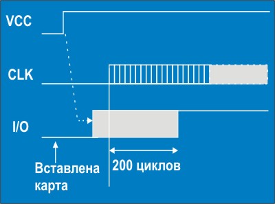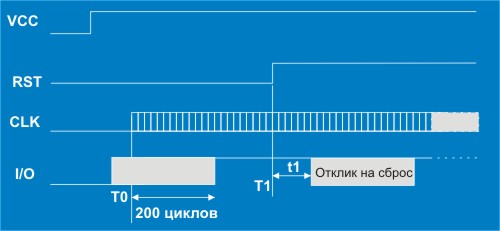 Рис. 4.6.4.3. Последовательность активации контактов ICC Через некоторое время после подачи на ICC напряжения питания Vcc начинают поступать тактовые импульсы. В исходный момент времени (сразу после вставления карты уровень сигналов на шине I/O является низким (L). Далее уровень этой шины может быть неопределенным (обозначено на рисунке серым прямоугольником), но после прихода 200 тактов этот уровень становится высоким (H). При этом уровень на шине RST остается низким (L). Терминал IFD устанавливает свой драйвер I/O в режим приема не позднее поступления 200-го такта. После этого выполняется процедура сброса (Reset). ICC откликается на команду RESET асинхронно. Время, когда на ICC начинают поступать тактовые импульсы, называется T0. Терминал поддерживает в это время уровень шины RST в низком состоянии.
