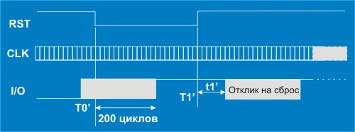 Рис. 4.6.4.4. Диаграмма реализации "холодного" сброса После прихода 40000-45000 тактов после Т0 шина RST переходит в состояние H. Этот момент времени называется T1. Начало отклика на Reset со стороны ICC наступает спустя 400-40000 тактов после T1 (время t1). Если за это время отклик со стороны ICC не поступает, терминал в пределах 50 мсек деактивирует контакты микросхемы на карте. Диаграмма холодного сброса ICC показана на рис. 4.6.4.4. Команда сброса может поступать и в процессе обычной работы - так называемый "теплый" сброс. Временная диаграмма такого сброса показана на рис. 4.6.4.5.