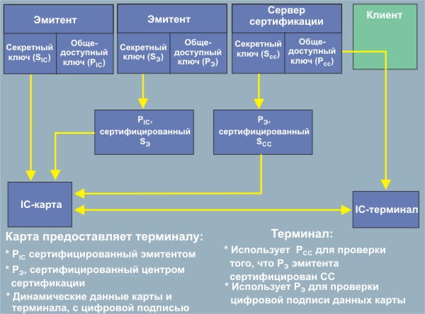 Статическая аутентификация выполняется терминалом, использующим цифровую подпись, которая базируется на методике общедоступных ключей. Эта техника позволяет подтвердить легитимность некоторых важных данных, записанных в ICC и идентифицируемых с помощью AFL (Application File Locator). Статическая аутентификация требует существования сертификационного сервера (или центра), который имеет надежную защиту и способен подписывать общедоступные ключи эмитента карты. Каждый терминал должен содержать общедоступный ключ центра сертификации для каждого приложения, распознаваемого терминалом. Взаимодействие клиента, центра сертификации и эмитента карты показано на рисунке 4.6.4.12.