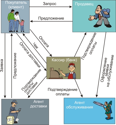 - В простейшем случае одна организация (напр., продавец) может оформлять покупку, принимать платеж, доставлять товар и