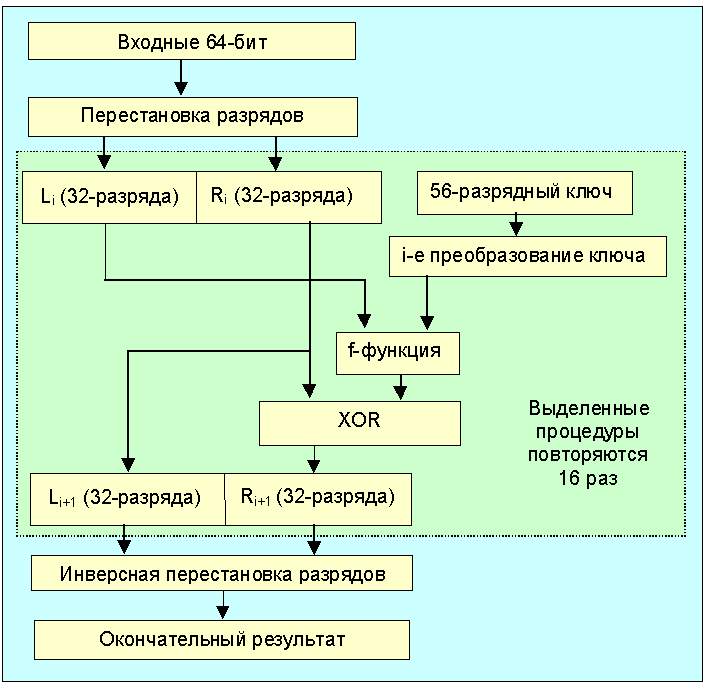 Рис. 6.4.1.1. Алгоритм работы функции f Преобразование начинается с перестановки бит (IP - Initial Permutation) в 64-разрядном блоке исходных данных. 58-ой бит становится первым, 50-ый - вторым и т.д. Схема перестановки битов показана ниже. 58 50 42 34 26 18 10 2 Полученный блок делится на две 32-разрядные части L0 и R0. Далее 16 раз повторяются следующие 4 процедуры: