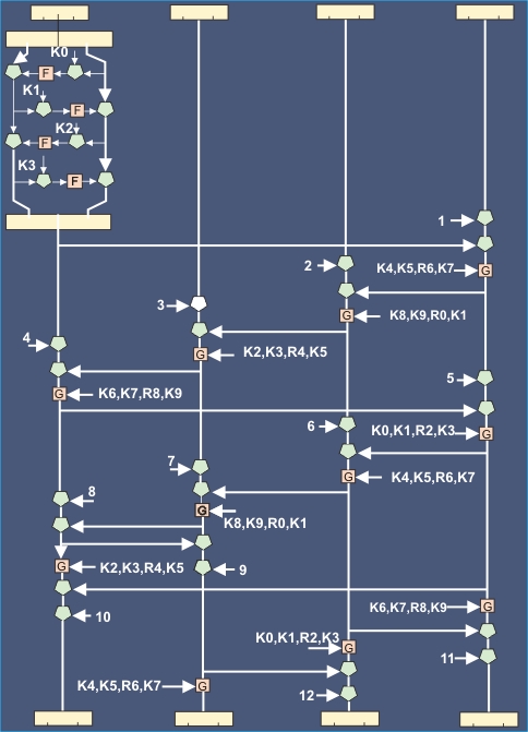 Рис. 6.4.7.2. Блок-схема алгоритма шифрования Skipjack G-перестановки включают в себя разделение группы из 16 бит на две подгруппы по 8 бит. Подобно DES левая половина кода не изменяется в процессе реализации цикла шифрования, а используется в качестве входного параметра F-функции, для результата которой и правой части кода выполняется операция XOR. В отличии от DES половины кода меняются местами лишь после завершающего цикла. F-функция G-перестановок достаточно проста: входные данные и субключ цикла объединяются операцией XOR, а результат заменяется кодом из таблицы просмотра (lookup-таблица - F). Субключи для G имеют длину 8 бит и являются первыми четырьмя байтами 80-битового исходного ключа. Первые 4 байта используются в первом цикле, следующие 4 - во втором, последние 2 байта вместе с первыми двумя - в третьем и т.д. 12 первых циклов реализации алгоритма шифрования Skipjack показаны на рис. 6.4.7.2. Первый цикл типа А отображен вместе со схемой реализации G-функции. Для следующих 7 циклов типа А G-функция отмечена квадратиком с буквой G. Цифрами (1-12) отмечен ввод данных для цикла с соответствующим номером. При реализации F-функции используется таблица (16*16) перестановок кодов 0-255. В случае дешифровки циклы выполняются в обратном порядке. Аналогом цикла А при дешифровке является последовательность операций: Для групп бит W1 и W2 и номера цикла выполняется операция XOR (циклы здесь нумеруются, начиная с 32 до 1). Затем W2 подвергается обратной G-перестановке, после чего выполняется перенос: W1 -> W4; W2 -> W1; W3 -> W2; W4 -> W3. Аналог цикла типа В при дешифровке включает в себя следующие операции: Группа бит W2 подвергается обратной G-перестановке. W3 объединяется с номером цикла и группой бит W2 с помощью операции исключающее ИЛИ. После чего производится перемещение: W1 -> W4; W2 -> W1; W3 -> W2; W4 -> W3. |
