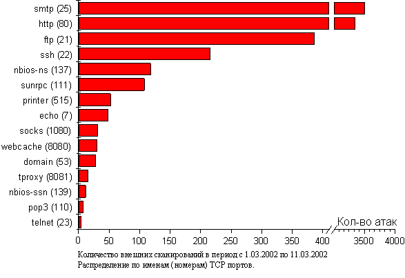 Ниже на рис. 2 показано распределение атак сети ИТЭФ по их разновидностям (Это и последующие два распределения построены студентом МФТИ А.Тарховым).