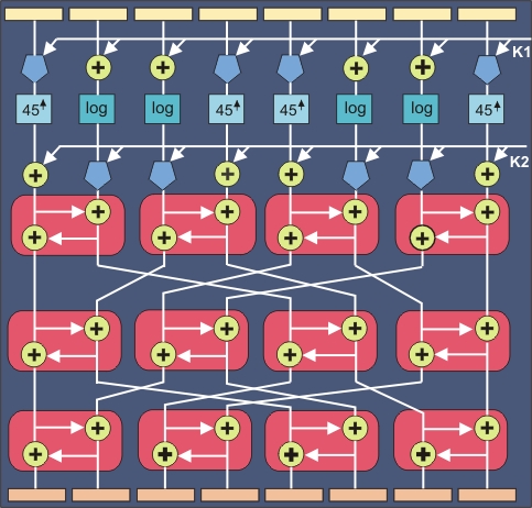 253 77 124 183 11 238 173 75 Обратная матрица при этом имеет вид. 128 0 176 9 96 239 185 253 112 237 232 236 114 179 21 195 32 169 157 132 152 5 156 187 121 223 170 246 62 163 241 17 208 80 89 63 77 98 52 10 95 249 212 85 11 220 55 49 41 160 143 178 90 216 166 126 109 240 2 40 206 221 155 234 После обработки с помощью S-матрицы используется второй субключ, который воздействует на блок преобразуемых данных. В этом случае используется другая последовательность операций: ADD, XOR, XOR, ADD, ADD, XOR, XOR, ADD (сравните с порядком операций, указанным в первом абзаце главы). Далее байты группируются: второй байт заменяется суммой первого байта и второго, первый - суммой нового значения второго байта и первого, четвертый - суммой третьего и четвертого, третий - суммой нового значения четвертого и третьего и т.д. вплоть до 8 байта включительно (см. рис. 6.4.8.1). При суммировании в результате операции учитываются только младшие 8 бит. По завершении этой процедуры байты выкладываются в следующем порядке (цифры означают старое положений байтов):