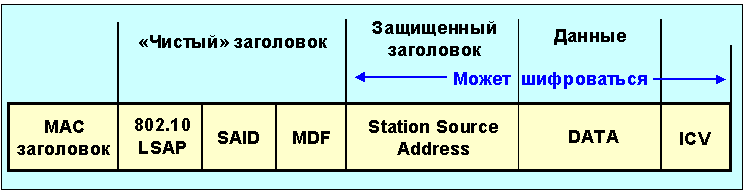 Широкое внедрение ИНТРАНЕТ, где группы разбросанных по сети пользователей локальных сетей объединяются друг с другом с помощью виртуальных каналов VLAN (Virtual Local Area Network; http://www.3com.com/nsc/200374.html), потребовало разработки новых протоколов. Архитектура VLAN позволяет эффективно разделять трафик, лучше использовать полосу канала, гарантировать успешную совместную работу сетевого оборудования различных производителей и обеспечить высокую степень безопасности. При этом пакеты следуют между портами в пределах локальной сети. В последнее время для задач построения VLAN разработан стандартный протокол IEEE 802.10 (3-ий сетевой уровень). Этот протокол предполагает, что пакеты VLAN имеют свои идентификаторы, которые и используются для их переключения. Протокол может поддерживать работу 500 пользователей и более. Полное название стандарта - IEEE 802.10 Interoperable LAN/MAN Security (MAN - Metropolitan Area Network - региональная или муниципальная сеть). Стандарт принят в конце 1992 года. Количество VLAN в пределах одной сети практически не ограничено. Протокол позволяет шифровать часть заголовка и информационное поле пакетов. Стандарт ieee 802.10 определяет один протокольный блок данных (PDU), который носит название SDE (Secure Data Exchange) PDU. Заголовок пакета ieee 802.10 имеет внутреннюю и внешнюю секции и показан на рис. 6.2.1.