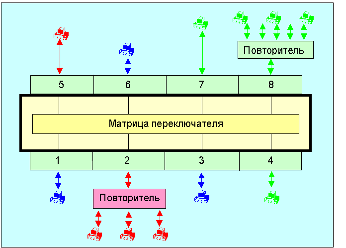 Рис. 6.2.2. Схема переключателя (или концентратора) с поддержкой VLAN. Для формирования VLAN необходимо устройство, где возможно осуществлять управление тем, какие порты могут соединяться. Например, пусть запрограммирована возможность пересылки пакетов между портами 1, 3 и 6, 2 и 5, а также между портами 4, 7 и 8. Тогда пакет из порта 1 никогда не попадет в порт 2, а из порта 8 в порт 6 и т.д. Таким образом, переключатель как бы разделяется на три независимых переключателя, принадлежащих различным виртуальным сетям. Управление матрицей переключения возможно через подключаемый из вне терминал или удаленным образом с использованием протокола SNMP. Если система переключателей, концентраторов (и возможно маршрутизаторов) запрограммирована корректно, возникнет три независимые виртуальные сети. Данная технология может быть реализована не только в рамках локальной сети. Возможно выделение виртуальной сети в масштабах Интернет. В сущности, идея создания корпоративных сетей в Интернет (ИНТРАНЕТ) является обобщением идей виртуальных сетей на региональные сети. Такая корпоративная сеть должна иметь один шлюз для входа в Интернет. Такой шлюз может выполнять функции Firewall, решая проблемы безопасности корпоративной сети. |