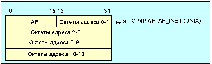 При необходимости прервать блокирующую операцию можно вызвать процедуру WSACancelBlockingCall, прикладная программа получит при этом сообщение об ошибке (WSAEINTR). Оператор WSAIsBlocking возвращает значение TRUE, если в данный момент реализуется блокирующая операция. Последние два оператора из четырех названных служат для построения пользовательских обработчиков сообщений. Аппарат соединителей предполагает возникновение и исчезновение вычислительных и управляющих процессов. Новый процесс может наследовать "старые" соединители. В этом случае может возникнуть необходимость выяснить, адрес партнера, с которым взаимодействует данный соединитель. Эту задачу можно решить с помощью команды getpeername(s, destaddr, addrlen), где destaddr - указатель на структуру типа (рис. 7.5):