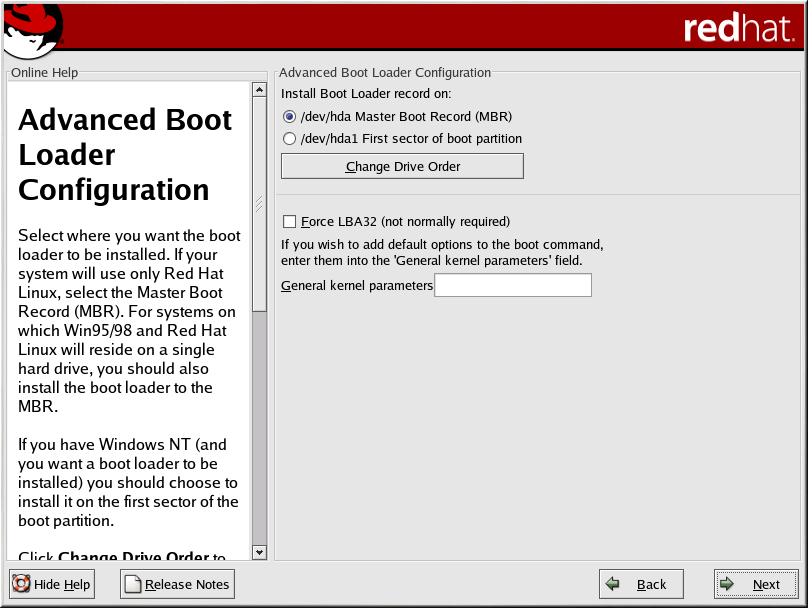 Лучше всего ставить именно туда, если только там уже не стоит загрузчик другой операционной системы, например, System Commander. MBR — специальная область диска, которую BIOS использует для загрузки системы. MBR является отправной точкой, откуда загрузчик может управлять процессом загрузки системы. Если вы установите его в MBR, то при загрузке машины появится приглашение GRUB или LILO. После этого вы можете загрузить Red Hat Linux или другие ОС, которые были указаны во время конфигурации загрузчика.