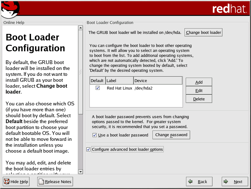 Если нашлись причины не устанавливать GRUB или LILO, то вы не сможете напрямую загружать Red Hat Linux, придется использовать другой способ загрузки (например, загрузочную дискету). Делайте такой выбор, только будучи уверенными, что есть другой способ загрузить Red Hat Linux! |