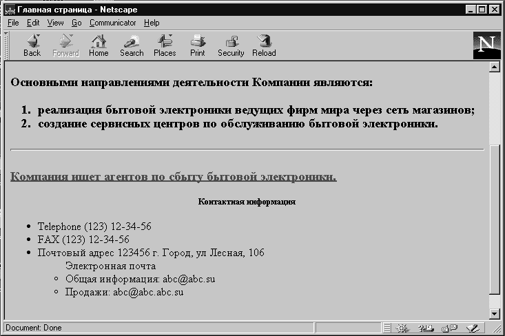 <HTML> <HEAD> <TITLE> Главная страница</TITLE> </HEAD> <BODY> <H1 ALIGN=CENTER>Компания.</H1> <HR> <H3 ALIGN=LEFT><I>Открытое акционерное общество Компания осно-ванная в 1996 году, является одним из ведущих поставщиков бытовой электроники в России.</I></H3> <HR> <H3>Основными направлениями деятельности Компании являются: <OL> <LI>реализация бытовой электроники ведущих фирм мира через сеть магазинов; <LI>создание сервисных центров по обслуживанию бытовой электроники.</H3> </OL> <HR> <H3><U><FONT COLOR=RED> Компания ищет агентов по сбыту бытовой электроники.</FONT></U></H3> <H5 ALIGN=CENTER>Контактная информация</H5> <UL> <LI>Telephone (123) 12-34-56 <LI>FAX (123) 12-34-56 <LI>Почтовый адрес 123456 г. Город, ул Лесная, 106 <UL TIPE=CIRCLE>Электронная почта<BR> <LI>Общая информация: abc@abc.su <LI>Продажи: abc@abc.abc.su</UL></UL> <BR><BLINK>Copyright</BLINK> Ы 1997 Компания </BODY> </HTML>