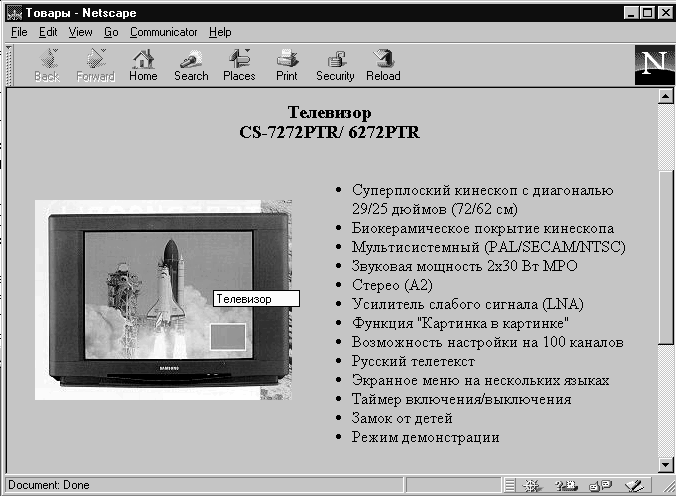<HTML> <HEAD> <TITLE> Товары</TITLE> </HEAD> <BODY> <H1 ALIGN=CENTER>Компания.</H1> <HR> <p ALIGN=CENTER><font color="#400040" size="4"> [ <a href="news.htmll">Новости</a> | <a href="products.htmll">Товары</a> | <a href="servis.htmll">Услуги</a> | <a href="contact.htmll">Контакты</a> | <a href="search.html">Поиск</a> ] </font> <HR> <H3 ALIGN=CENTER> Телевизор <BR>СS-7272РТR/ 6272РТR </H3> <br><img src="cs727.jpg" align=left hspace=20 vspace=20 ALT="Телевизор"> <UL> <LI>Суперплоский кинескоп с диагональю 29/25 дюймов (72/62 см) <LI>Биокерамическое покрытие кинескопа <LI>Мультисистемный (РАL/SЕСАМ/NTSC) <LI>Звуковая мощность 2х30 Вт МРО <LI>Стерео (А2) <LI>Усилитель слабого сигнала (LNА) <LI>Функция "Картинка в картинке" <LI>Возможность настройки на 100 каналов <LI>Русский телетекст <LI>Экранное меню на нескольких языках <LI>Таймер включения/выключения <LI>Замок от детей <LI>Режим демонстрации </UL> <HR> <H3 ALIGN=CENTER>Контактная информация</H3> <UL> <LI>Telephone (123) 12-34-56 <LI>FAX (123) 12-34-56 <LI>Почтовый адрес 123456 г. Город, ул Лесная, 106 <UL TIPE=CIRCLE>Электронная почта <BR><LI>Общая информация: abc@abc.su <LI>Продажи: abc@abc.abc.su </UL> </UL> <BR> <BLINK>Copyright</BLINK> Ы 1997 Компания </BODY> </HTML>
