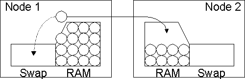 Основные алгоритмы разделения ресурсов в MOSIX это распределение нагрузки (load-balancing) и диспетчер памяти (memory ushering). Динамический алгоритм распределения нагрузки непрерывно пытается уменьшить разницу в загрузке между парами узлов миграцией процессов с более загруженного узла на менее нагруженный. Эта схема децентрализована: все узлы запускают одни и те же алгоритмы, и уменьшение загрузки различно нагруженных выполняется независимо от пар узлов. Число процессоров на каждом из узлов и их скорость являются важным фактором для алгоритма распределения нагрузки. Этот алгоритм реагирует на изменение загрузки на узле или на характеристики процессора в реальном режиме времени. Это доминирует до тех пор, пока нет критической нехватки ресурсов, например, свободной памяти или слотов для процессов. Алгоритм предотвращения истощения памяти работает при росте потребления оперативной памяти процессом (процессами), позволяет избежать своппинга. Алгоритм срабатывает, когда узел запускает страницу памяти превышающую наличную свободную память (рис. 2). В этом случае алгоритм подменяет алгоритм распределения нагрузки и пытается мигрировать процесс на узел, на котором имеется в достаточном количестве свободная память, необходимая для миграции, но возможно неравномерная по распределению нагрузки).