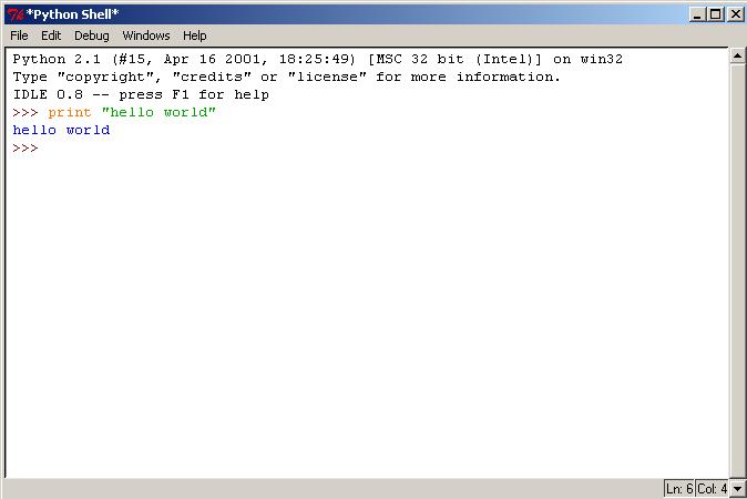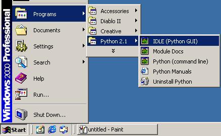 Предположим, что Питон у Вас уже установлен, если нет - то сходите на http://python.org и скачайте свежую версию интерпретатора. Когда писалась эта статья, то свежей была версия 2.1. Первой вещью, которую вы сделаете, будет запуск интегрированной среды Питона IDLE! Мы сделаем это, запустив соответствующую ссылку из меню Start в только что созданной программной группе Питона.