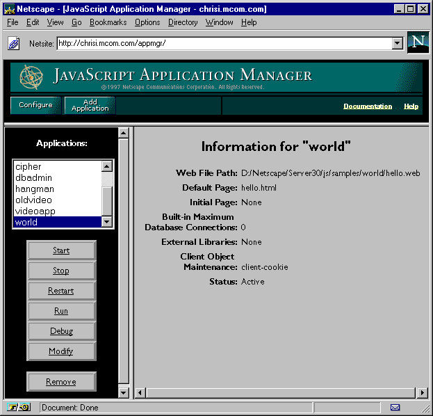 Application Manager отображает в прокручиваемом левом фрэйме (кадре/окне) все приложения JavaScript, установленные в данный момент на сервере. Выберите нужное приложение, щёлкнув на его имени в прокручиваемом списке.