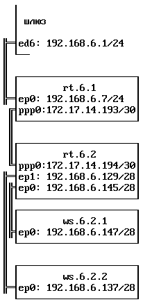 ifconfig ep0 inet 192.168.6.137 netmask 255.255.255.240 route add default 192.168.6.129Подсеть на 16 машин выделена аналогично примеру 4. Я надеюсь, разбиение сети на подсети "круглого" размера, соединенные по ppp, после усвоение прочитанного окажется под силу любому.