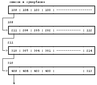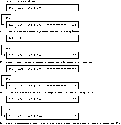 Когда процесс записывает данные в файл, ядро должно выделять из файловой системы дисковые блоки под информационные блоки прямой адресации и иногда под блоки косвенной адресации. Суперблок файловой системы содержит массив, используемый для хранения номеров свободных дисковых блоков в файловой системе. Сервисная программа mkfs ("make file system" - создать файловую систему) организует информационные блоки в файловой системе в виде списка с указателями так, что каждый элемент списка указывает на дисковый блок, в котором хранится массив номеров свободных дисковых блоков, а один из элементов массива хранит номер следующего блока данного списка.