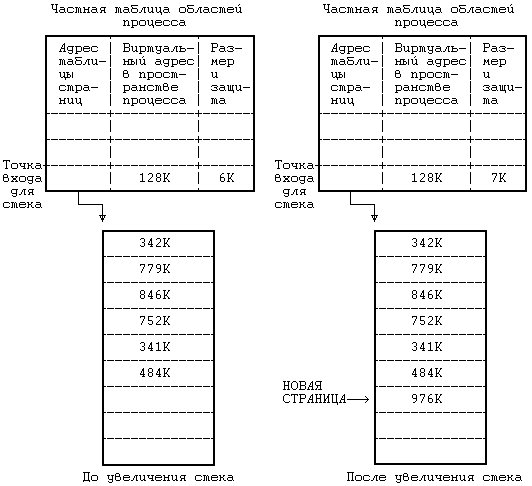 Предположим, например, что область стека процесса начинается с виртуального адреса 128К и имеет размер 6 Кбайт и что ядру нужно расширить эту область на 1 Кбайт (1 страницу). Если размер процесса позволяет это делать и если виртуальные адреса в диапазоне от 134К до 135К - 1 не принадлежат какой-либо области, ранее присоединенной к процессу, ядро увеличивает размер стека. При этом ядро расширяет таблицу страниц, выделяет новую страницу памяти и инициализирует новую запись таблицы. Этот случай проиллюстрирован с помощью Рисунка 6.22.