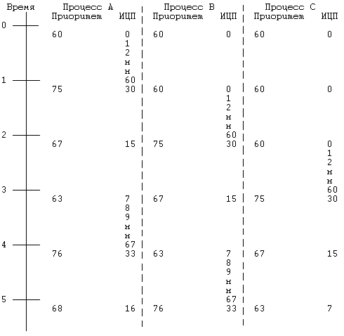 Если предположить, что первым запускается процесс A и ему выделяется квант времени, он выполняется в течение 1 секунды: за это время таймер посылает системе 60 прерываний и столько же раз программа обработки прерываний увеличивает для процесса A значение поля, содержащего показатель ИЦП (с 0 до 60). По прошествии секунды ядро переключает контекст и, произведя пересчет приоритетов для всех процессов, выбирает для выполнения процесс B. В течение следующей секунды программа обработки прерываний по таймеру 60 раз повышает значение поля ИЦП для процесса B, после чего ядро пересчитывает параметры диспетчеризации для всех процессов и вновь переключает контекст. Процедура повторяется многократно, сопровождаясь поочередным запуском процессов на выполнение.