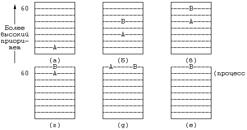 Теперь рассмотрим процессы с приоритетами, приведенными на Рисунке 8.5, и предположим, что в системе имеются и другие процессы. Ядро может выгрузить процесс A, оставив его в состоянии "готовности к выполнению", после того, как он получит подряд несколько квантов времени для работы с ЦП и снизит таким образом свой приоритет выполнения в режиме задачи (Рисунок 8.5а). Через некоторое время после запуска процесса A в состояние "готовности к выполнению" может перейти процесс B, приоритет которого в тот момент окажется выше приоритета процесса A (Рисунок 8.5б). Если ядро за это время не запланировало к выполнению любой другой процесс (из тех, что не показаны на рисунке), оба процесса (A и B) при известных обстоятельствах могут на некоторое время оказаться на одном уровне приоритетности, хотя процесс B попадет на этот уровень первым из-за того, что его первоначальный приоритет был ближе (Рисунок 8.5в и 8.5г). Тем не менее, ядро запустит процесс A впереди процесса B, поскольку процесс A находился в состоянии "готовности к выполнению" более длительное время (Рисунок 8.5д) - это решающее условие, если выбор производится из процессов с одинаковыми приоритетами.