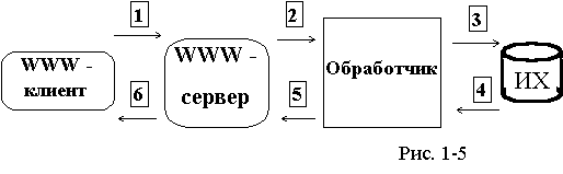 В этом варианте доступ к БД осуществляется специальной CGI-программой, запускаемой WWW-сервером в ответ на запрос WWW - клиента. Эта программа, обрабатывая запрос, просматривает содержимое БД и создает выходной HTML-документ, возвращаемый клиенту (см.рис.1-3).