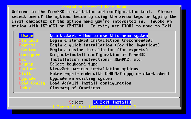 Answer Y to save the parameters and the probing will start. After displaying the probe results in white on black text Sysinstall will start and display its main menu (Figure 2-5).
