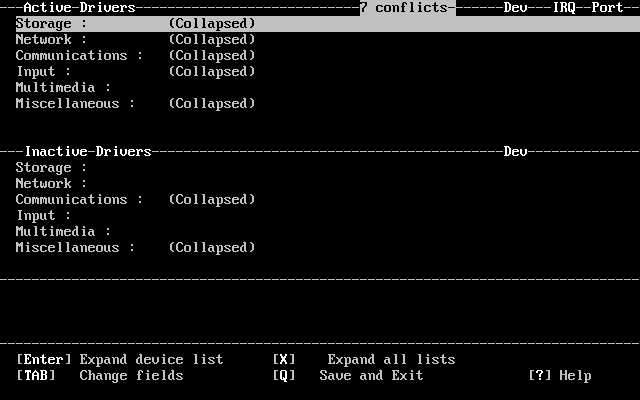 A collapsible list of all the drivers that are currently marked as ``active'', subdivided into groups such as Storage, and Network. Each driver is shown as a description, its two or three letter driver name, and the IRQ and memory port used by that driver. In addition, if an active driver conflicts with another active driver then CONF is shown next to the driver name. This section also shows the total number of conflicting drivers that are currently active.