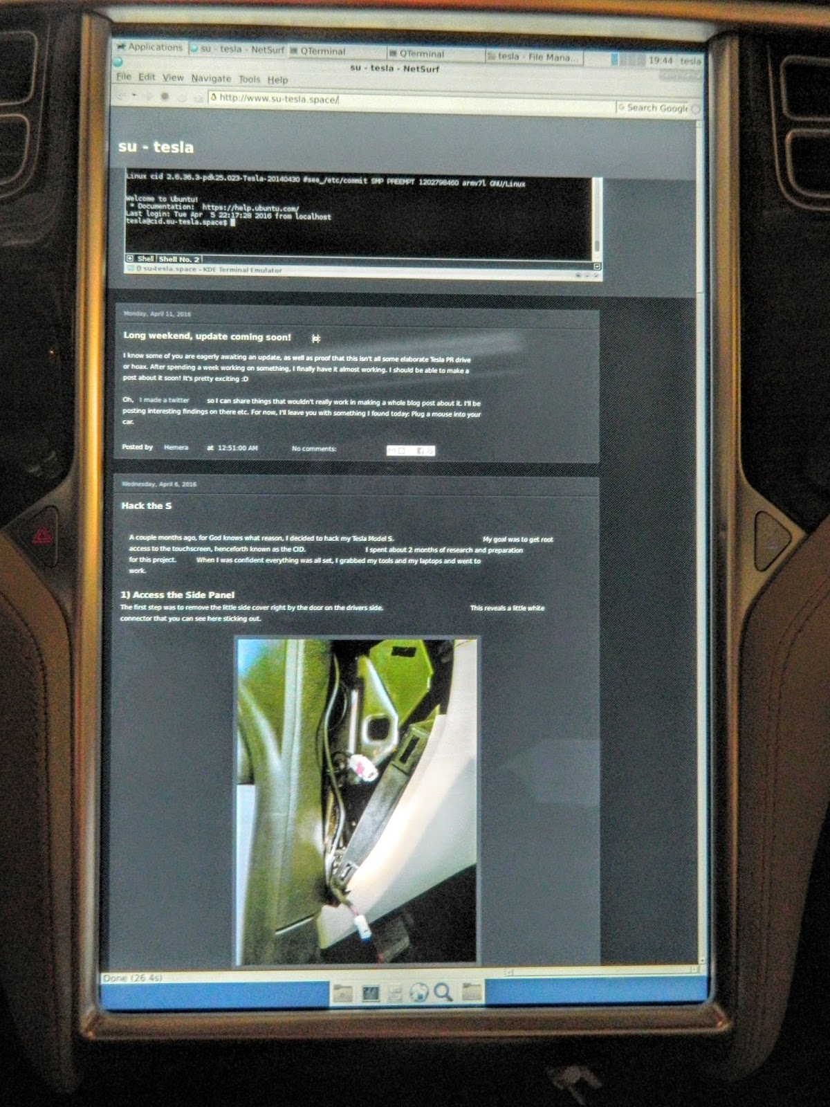 Исследовательница под ником Hemera продемонстрировала (http://www.su-tesla.space/2016/04/gentoo-tesla-t2-edition.html) успешный запуск Gentoo Linux с рабочим столом Xfce в окружении информационно-развлекательной системы автомобиля Tesla Model S. Для получения прав root в штатном автомобильном окружении Hemera применила (http://www.su-tesla.space/2016/04/hack-s.html) неопубликованный эксплоит, предварительно переведя (http://www.su-tesla.space/2016/04/hack-s.html) информационную систему автомобиля в режим разработчика ("Factory Mode"), позволивший получить доступ к shell. | ||