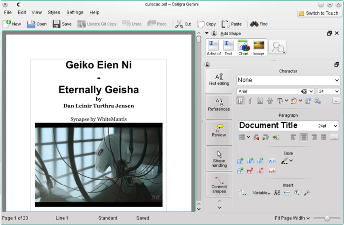>Для просмотрщика документов Okular подготовлен специальный плагин, позволяющий использовать движок Calligra для отображения форматов OpenDocument Text (ODT), MS Word (DOC, DOCX), WordPerfect (WPD), OpenDocument Presentation (ODP) и MS Powerpoint (PPT, PPTX).
